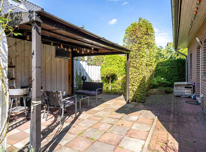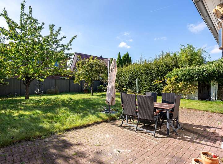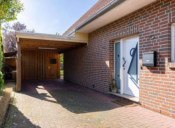 Der pflegeleicht angelegte Gartenbereich verfügt über verschiedene Obstbäumen und lädt zum Verweilen ein. Eine überdachte Terrasse bietet Raum für gemütliche Stunden im Freien – bei jedem Wetter. Zusätzlich stehen ein Carport sowie ein separater Geräteraum zur Verfügung, der ausreichend Stauraum für Gartengeräte und Fahrräder bietet.
