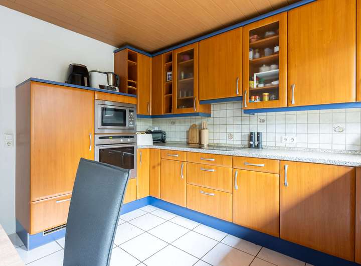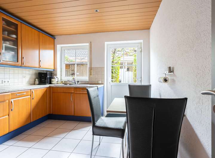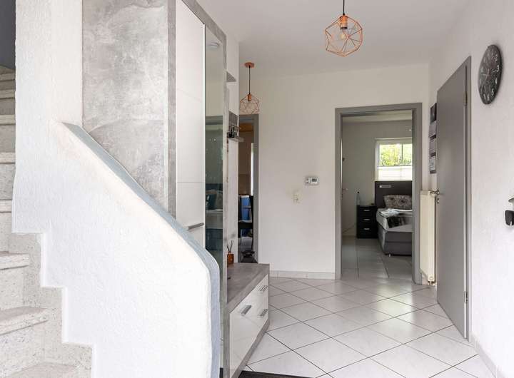 Bereits beim Betreten des Hauses überzeugt die durchdachte Raumaufteilung. Auf der rechten Seite befindet sich ein modern gestaltetes Badezimmer mit Dusche. Direkt angrenzend liegt der Hauswirtschaftsraum, der über eine praktische Tür direkten Zugang nach draußen bietet. Ebenfalls im Erdgeschoss befinden sich ein vielseitig nutzbares Zimmer - sei es als Büro oder Gästezimmer – sowie die Küche.