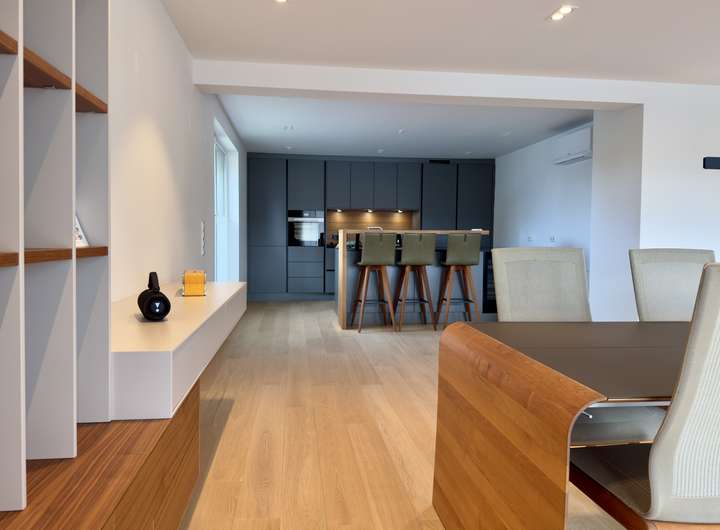 Der großzügige Wohnbereich mit Süd-West-Balkon lädt zum Entspannen ein. Zwei moderne Bäder, maßgefertigte Einbauschränke, raumhohe Türen und LED-Beleuchtung sorgen für ein elegantes Wohnambiente. Das klimatisierte Schlafzimmer und Esszimmer bieten zusätzlichen Komfort.