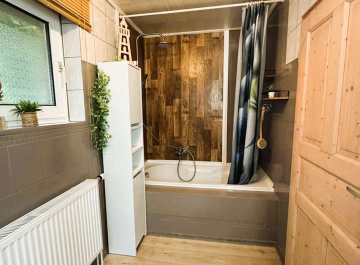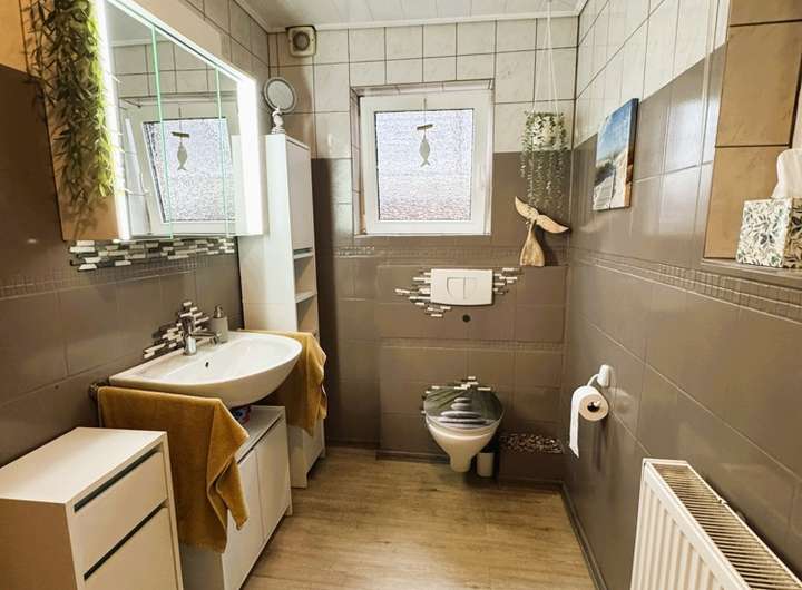 Das Tageslicht-Badezimmer datiert vermutlich aus den 1990er Jahren, die Fliesen wurden jedoch nachträglich gestrichen und der Boden mit Klickvinyl ausgelegt (darunter Fliesen). 2 Fenster sorgen für Licht und frische Luft.