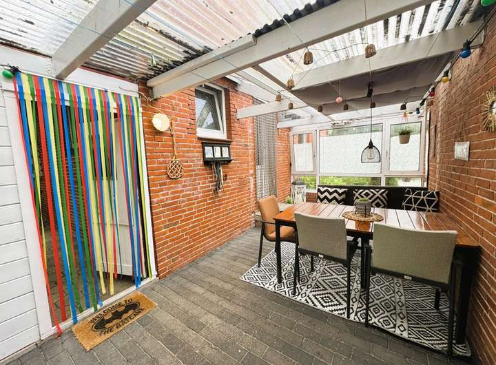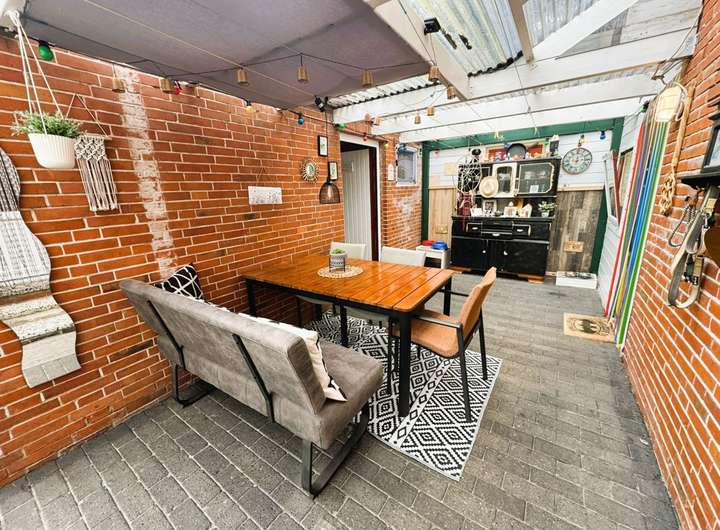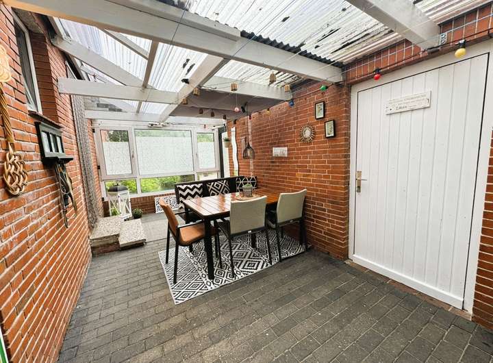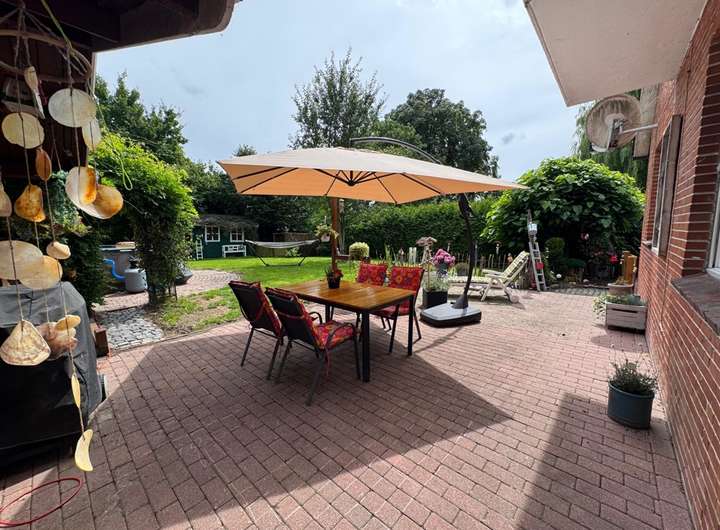 Der Sommergarten ist perfekt, wenn man auch bei nicht so schönem Wetter draußen sitzen möchte. Ein gemütlicher Bereich für Familie und Freunde. Von hier erreicht man das Nebengebäude mit HWR/Garage und auch den Garten.
