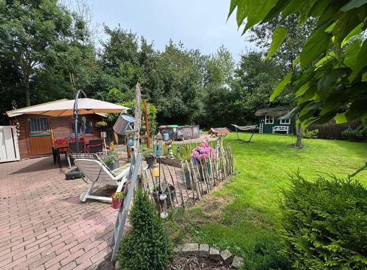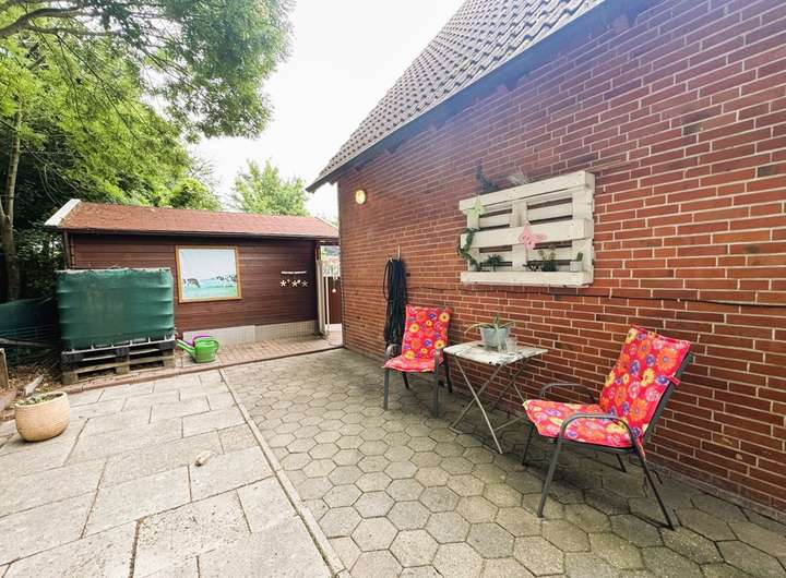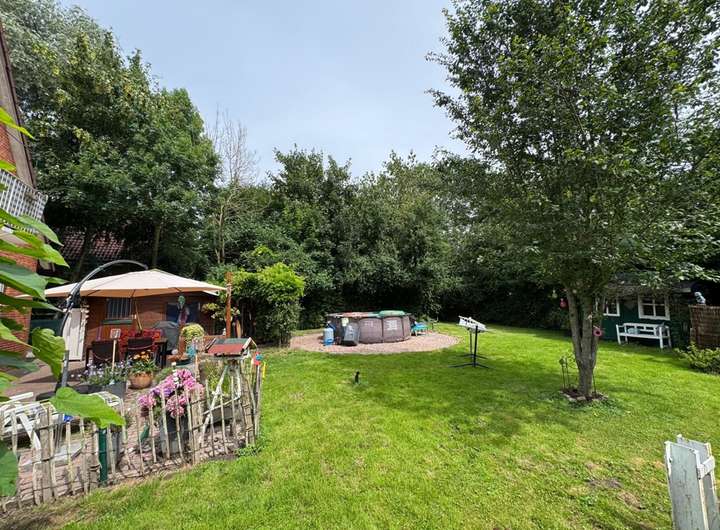 Hinter dem Haus liegt der sichtgeschützte Garten. Hier finden Sie Ruhe und Entspannung. 2 gepflasterte Terrassen, 2 Gartenhäuser und ein Aufstellpool können Sie hier in Ihrer Freizeit genießen.