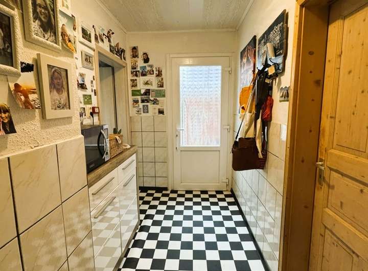 An die Küche grenzt ein zweiter Flur an. Von hier erreicht man das Badezimmer, den Keller und auch die überdachte Terrasse/Sommergarten.