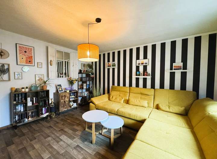Das freundliche Wohnzimmer bemisst rund 18 m² und ist mit PVC ausgelegt, darunter Holzfußboden.