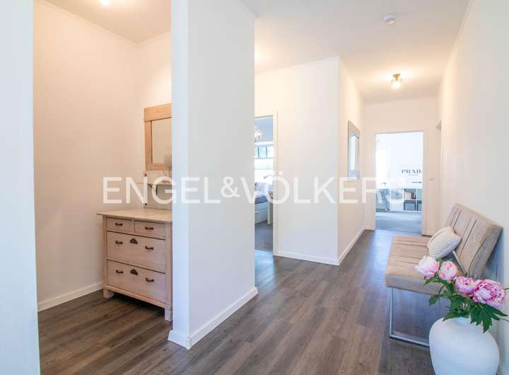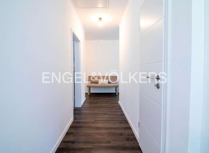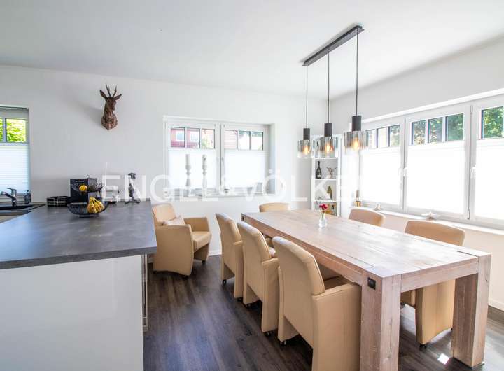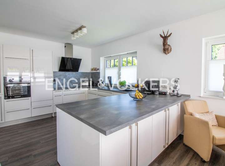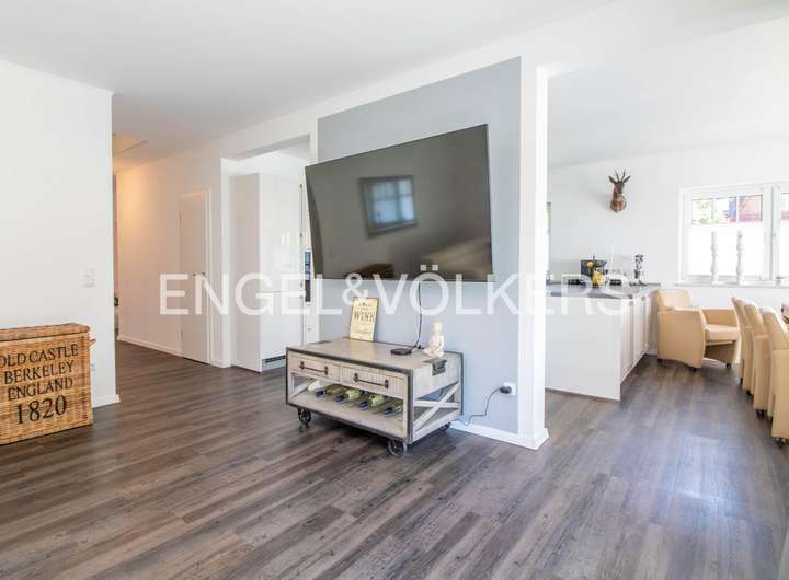 Vom zentral gelegenen Flur sind alle Räume bequem erreichbar. Der offene Wohn- und Essbereich mit angrenzender moderner Küche bildet das Herzstück des Hauses und sorgt für ein helles, freundliches Ambiente.
