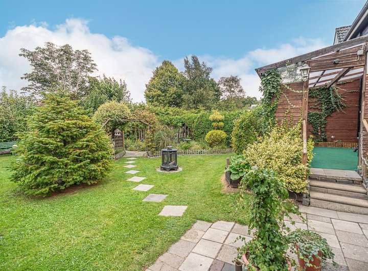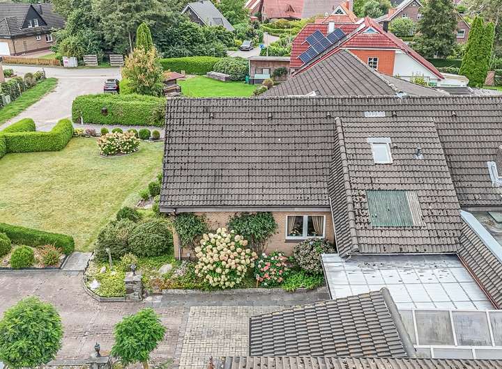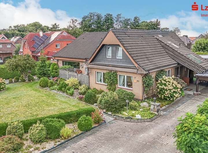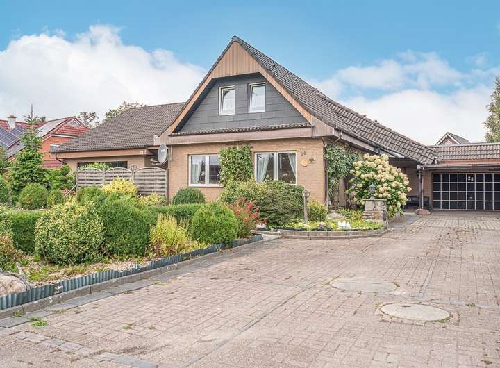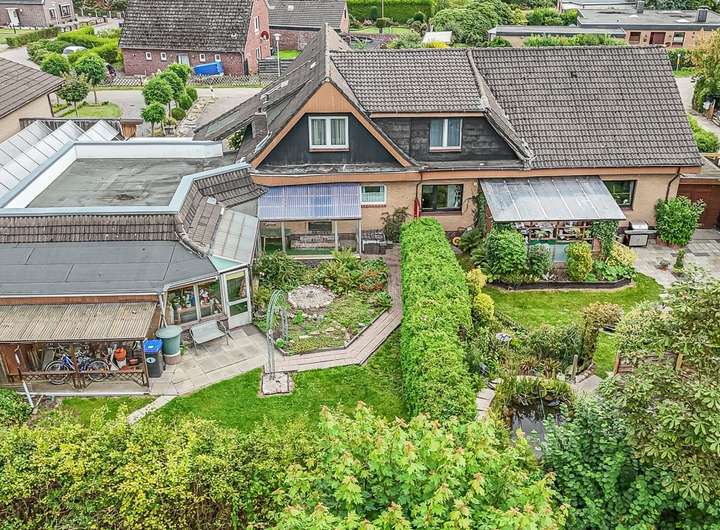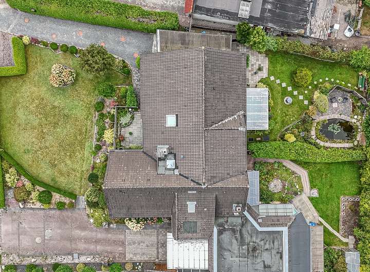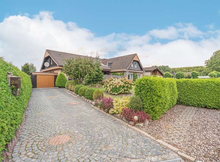 Der großzügige Garten lädt zum Verweilen ein, während zwei separate Auffahrten mit jeweils einer Garage die Eigenständigkeit der beiden Wohneinheiten betonen. Hier können mehrere Generationen nah beieinander leben und dennoch ihren eigenen Freiraum genießen.