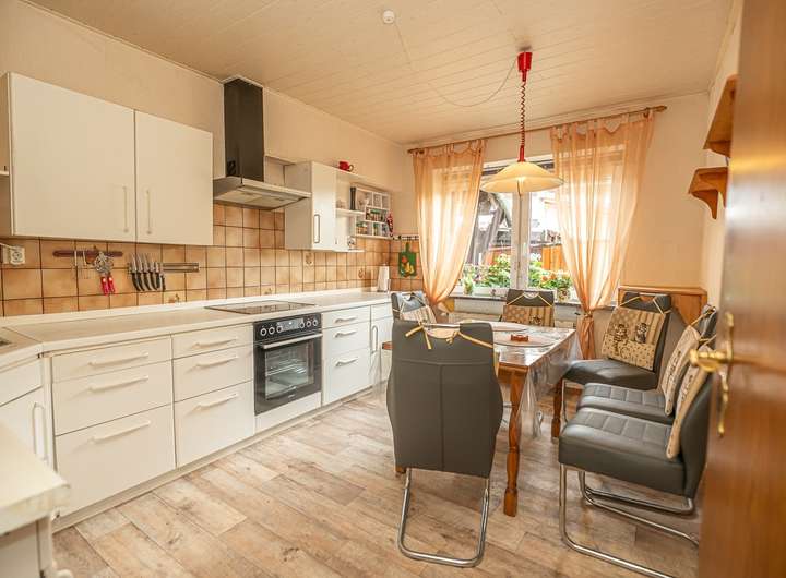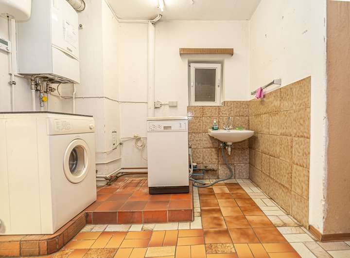 EG: Wohnzimmer, Küche, Bad, Gäste-WC, Waschküche, Flur; Garage, Werkstatt, Geräteraum