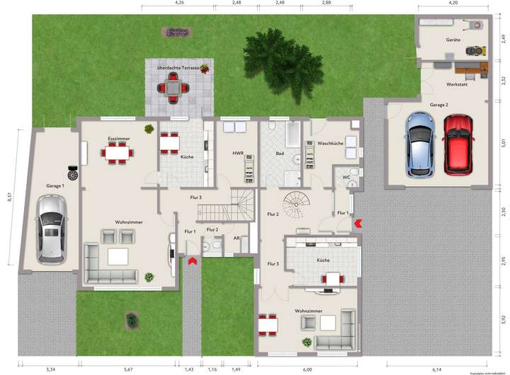 EG: Wohnzimmer, Esszimmer, Küche, HWR, Gäste-WC, Flur; Garage, überdachte Terrasse