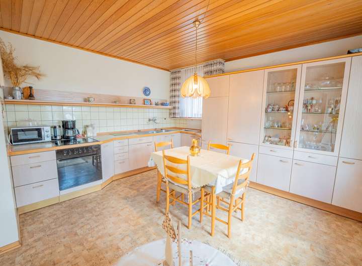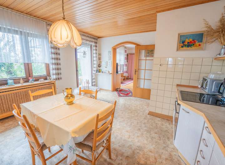 Offene Küche mit Essbereich und Zugang zur Terrasse und in den Garten