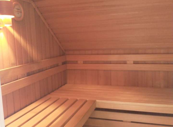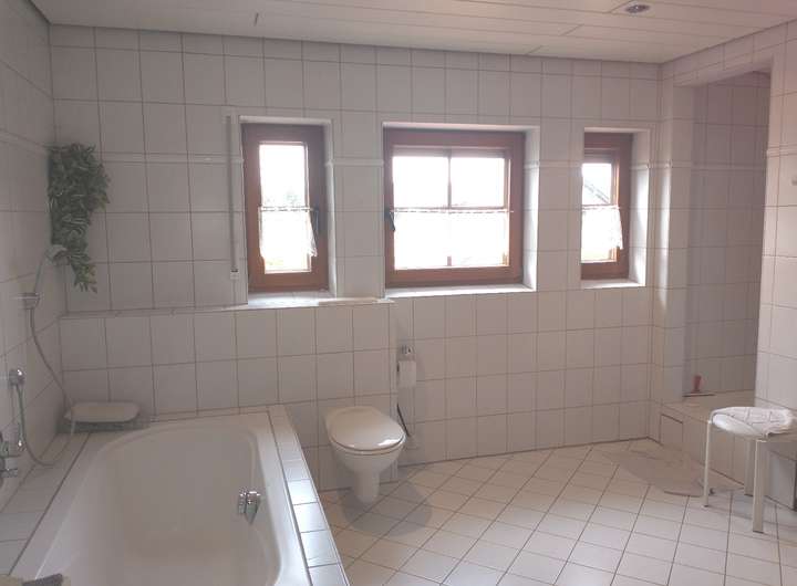 große Badezimmer mit Wanne, Dusche und Sauna.