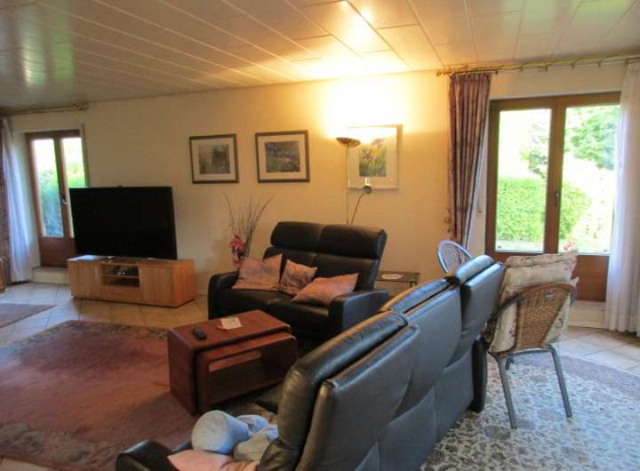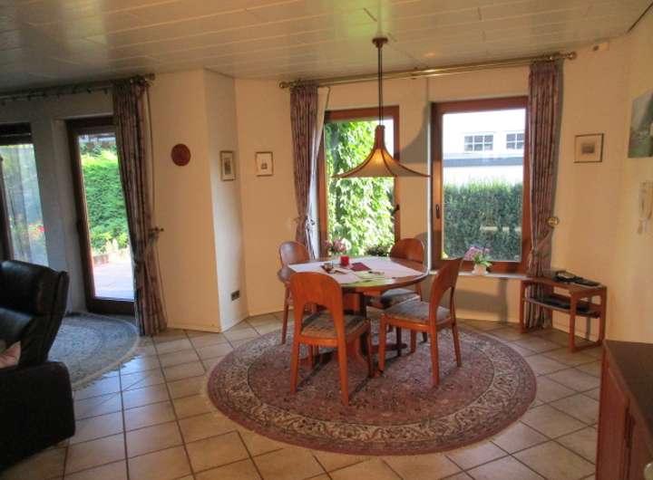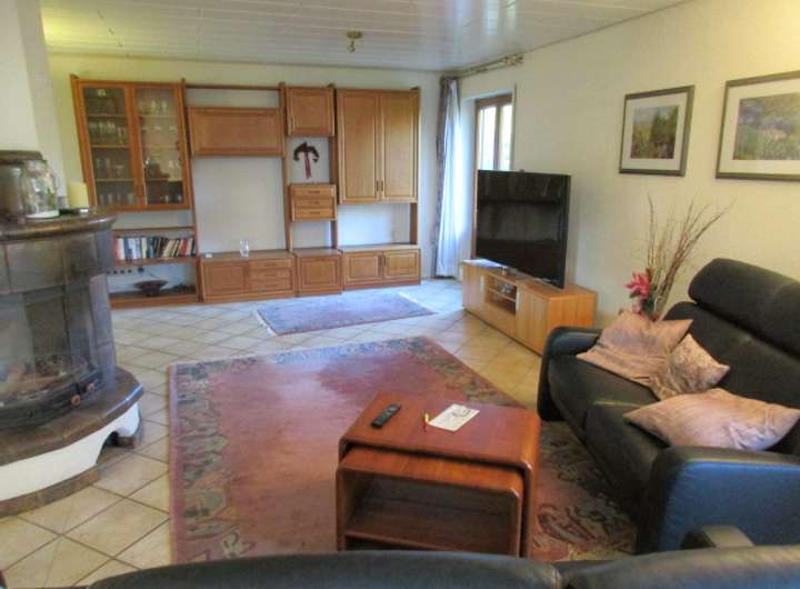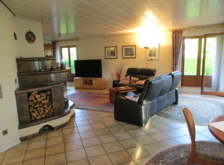 Im Erdgeschoss erwartet Sie ein großes Wohnzimmer mit Kachelofen/Kamin, der für wohlige Wärme sorgt. Ebenso befindet sich auf dieser Ebene der Essbereich, die angrenzende Küche, ein