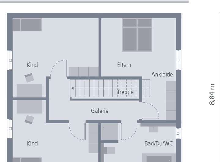 Geschmackvoll, lichtdurchflutet und offen - so lässt sich unser Haus Design 10 charakterisieren. Unter dem zeitlos-eleganten Satteldach laden rund 135 qm Wohnfläche zum Leben, Wohlfühlen und Träumen ein. Die offene Architektur im Erdgeschoss vermittelt ein Gefühl von Weite, ohne dabei an Gemütlichkeit und Behaglichkeit einzubüßen. Dafür sorgt die besondere Raumeinteilung: Die geräumige Diele geht - lediglich getrennt durch einen kleinen Vorsprung - direkt in den Koch- und Ess-Bereich über. Und der besticht nicht nur durch seine Größe, sondern auch durch seine Helligkeit. Dafür sorgen zahlreiche Fenster, die einen direkten Blick in den Garten gewähren. Auch das Wohnzimmer ist unmittelbar von der Diele aus zugänglich und mit seinen knapp 18 qm ein echter Wohlfühlort. Ebenfalls Parterre: Hauswirtschaftsraum sowie Gäste-WC. Über die Diele führt eine gerade Treppe in den Bereich, in dem Erholung und Entspannung im Fokus stehen. Hier befinden sich neben dem Schlafzimmer für die Eltern noch zwei Kinderzimmer sowie ein großes Bad. So geht stilvoll wohnen.