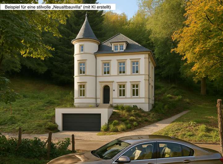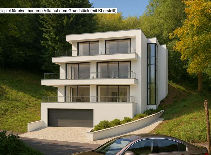 Drei realitätsnahe, mit Künstlicher Intelligenz erstellte Architektur-visualisierungen zeigen, wie vielseitig sich das Grundstück für ein exklusives Bauvorhaben als Einfamilienhaus entwickeln lässt: