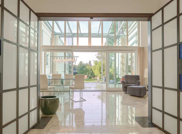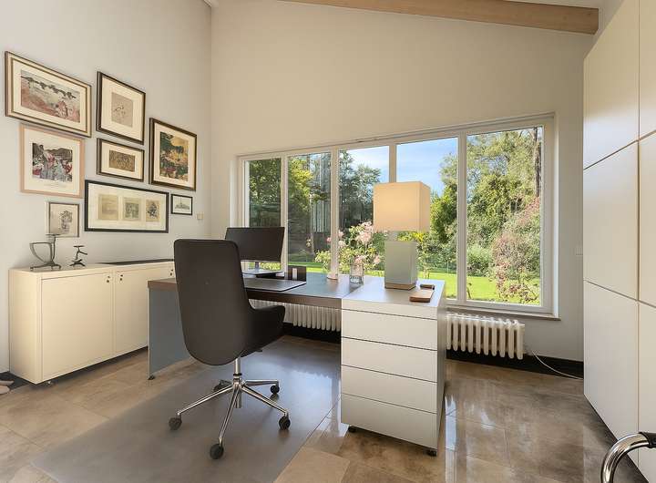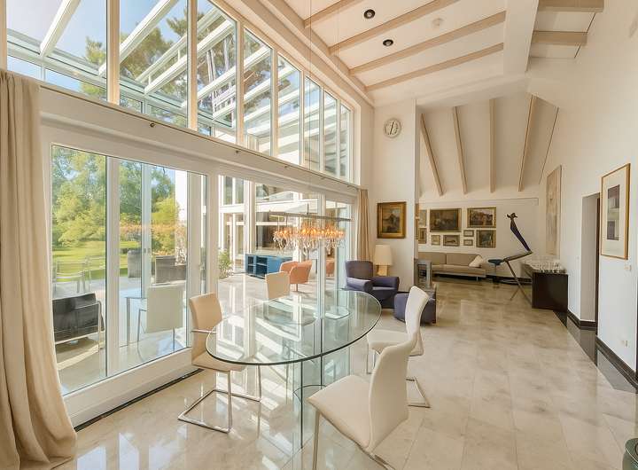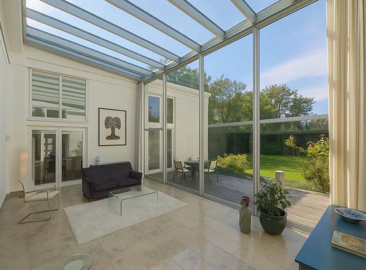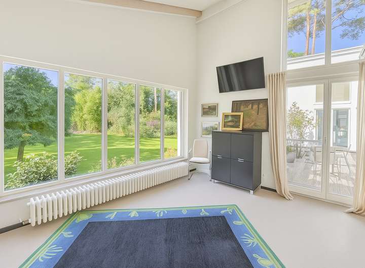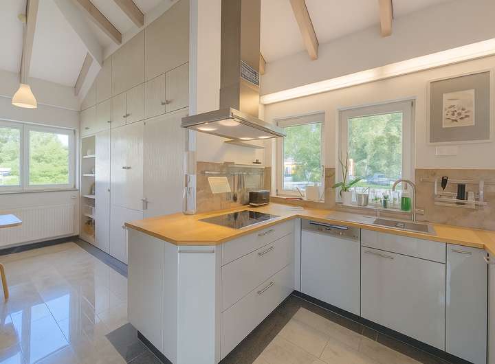 Diese besondere Immobilie vereint Bescheidenheit, Naturnähe und Exklusivität auf außergewöhnliche Weise. Der in U-Form errichtete Bungalow überzeugt mit einer markanten Architektur und durchdachter Raumgestaltung. Ein echtes Highlight ist der großzügige Wohn- und Essbereich, der sich durch eine imposante, bis zu 5 Meter hohe Fensterfront zur Gartenseite hin öffnet. So entsteht zu jeder Jahreszeit ein lichtdurchflutetes, naturnahes Wohnambiente – mit freiem Blick ins Grüne. Edle Materialien wie der hochwertige Marmorboden, eine moderne Fußbodenheizung sowie ein stilvoller Kamin sorgen für Komfort und ein behagliches Wohngefühl. Die vollausgestattete Einbauküche mit Geräten von Miele bietet beste Voraussetzungen für kulinarische Inspiration. Der im Jahr 2008 errichtete Wintergarten ist beheizbar und verfügt über eine integrierte Beschattungsanlage – der perfekte tägliche Rückzugsort. Das außergewöhnlich gestaltete Badezimmer lässt keine Wünsche offen: Badewanne, Dusche und eine hochwertige Avatec-Sauna schaffen eine private Wellness-Oase. Das Hauptschlafzimmer verfügt über eine separate Ankleide, während eine zusätzliche, abgeschlossene Einliegerwohnung mit Duschbad flexible Nutzungsmöglichkeiten bietet – ideal für Gäste, Pflegepersonal oder als Home-Office. Die moderne Photovoltaik-Anlage sowie eine Wallbox für E-Fahrzeuge unterstreichen die Energieeffizienz und Zukunftsorientierung dieser Immobilie. Im Untergeschoss befinden sich ein praktischer Hauswirtschaftsraum, die Heizungsanlage von Bosch, eine Entkalkungsanlage sowie ein Pufferspeicher. Die großzügige Doppelgarage mit ca. 50 m² bietet Platz für zwei Fahrzeuge. Eine moderne Alarmanlage sorgt zudem für Ihre Sicherheit.