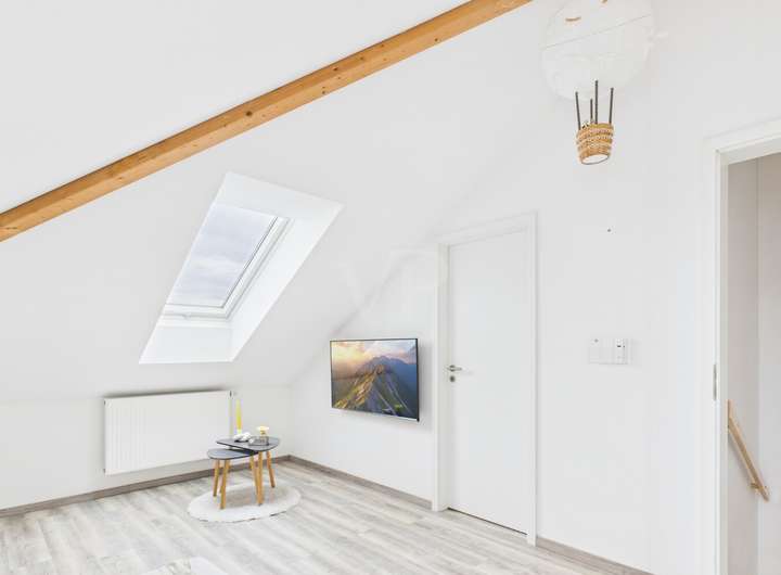 Im ausgebauten Dachgeschoss befindet sich ein weiteres Schlafzimmer mit Ankleide sowie ein bereits vorbereiteter Raum für ein Badezimmer.
