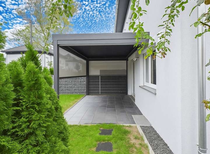 Ein besonderes Highlight bildet die Terrassenüberdachung mit Infrarotstrahler. Sie grenzt direkt an den offen gestalteten Wohn-Essbereich und lädt zu entspannten Stunden im Freien ein – unabhängig von Wetter und Jahreszeit. Der schön angelegte Garten ist mit viel Liebe zum Detail worden gestaltet und bietet ausreichend Platz für Freizeit, Spiel und Erholung.
