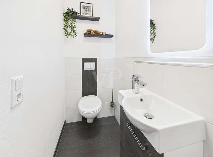Im Obergeschoss warten zwei gut geschnittene Schlafzimmer auf ihre neuen Bewohner. Als Ruhezone und Rückzugsort eignen sie sich hervorragend für Eltern und Kinder oder lassen sich flexibel als Homeoffice gestalten. Ein hochwertig in moderner Optik ausgestattetes Tageslichtbad mit Eckbadewanne und separater Dusche rundet das Raumangebot auf dieser Ebene ab.