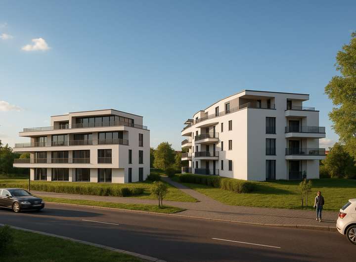 Die geplante Bebauung umfasst vier moderne Mehrfamilienhäuser mit insgesamt 32 Wohneinheiten, die sich auf vier Etagen verteilen. Jedes Haus verfügt über acht Wohneinheiten, die sich auf zwei bis drei Zimmer aufteilen. Die Wohnungen sind auf die Bedürfnisse von Singles, Paaren und kleinen Familien ausgerichtet und bieten ein komfortables und modernes Wohngefühl.