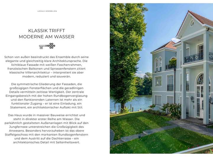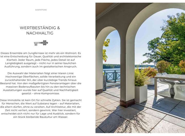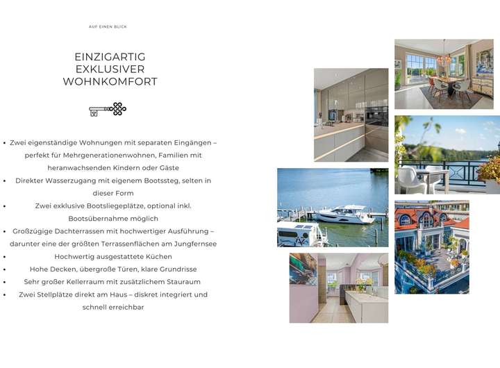 Jungfernsee Ensemble, zwei exklusive Wasserwohnungen mit Dachterrasse, Bootsliegeplatz und maximaler Privatsphäre. Direkter Seezugang, lichtdurchflutete Architektur, separate Eingänge und ein hochwertiges Zwei-Einheiten-Konzept, dieses Ensemble in der Tschudistraße vereint gleich zwei exklusive Wohnungen in einem architektonisch klar strukturierten Neubau. In einzigartiger Lage am Jungfernsee gelegen, bietet dieses Gesamtpaket eine seltene Gelegenheit: zwei autarke Wohneinheiten mit hochwertiger Ausstattung, großzügigen Freiflächen, einer gemeinsamen, überschaubaren Eigentümerstruktur und direktem Zugang zum Wasser.