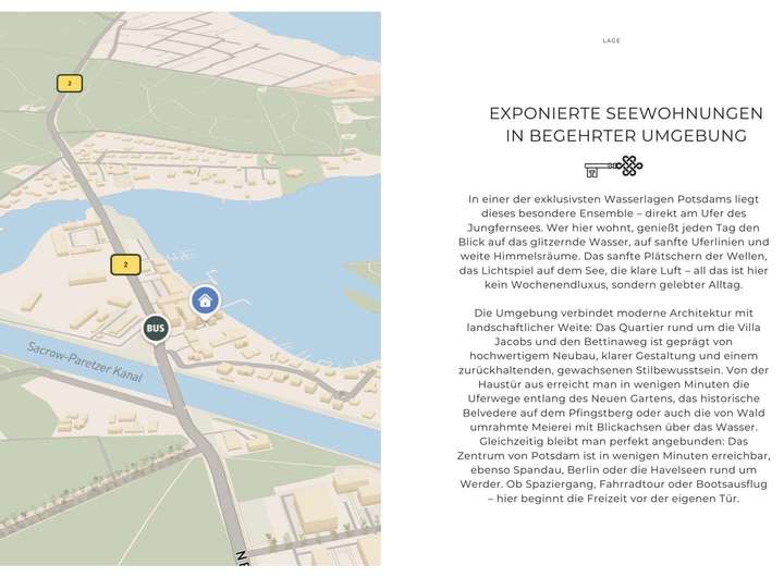 Rund um die Villa Jacobs, den Bettinaweg und das Ensemble Belvedere Jungfernsee reiht sich Neubau an Neubau, hochwertig, großzügig, mit Anspruch geplant und realisiert. Historische Villen sucht man hier vergebens, stattdessen findet man ein modernes, ruhiges und stilvolles Wohnumfeld, das auf eine anspruchsvolle Nachbarschaft trifft: diskret, weltoffen, etabliert. Die unmittelbare Nähe zum Wasser prägt dabei nicht nur das Lebensgefühl, sondern auch den Rhythmus des Alltags.