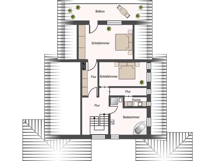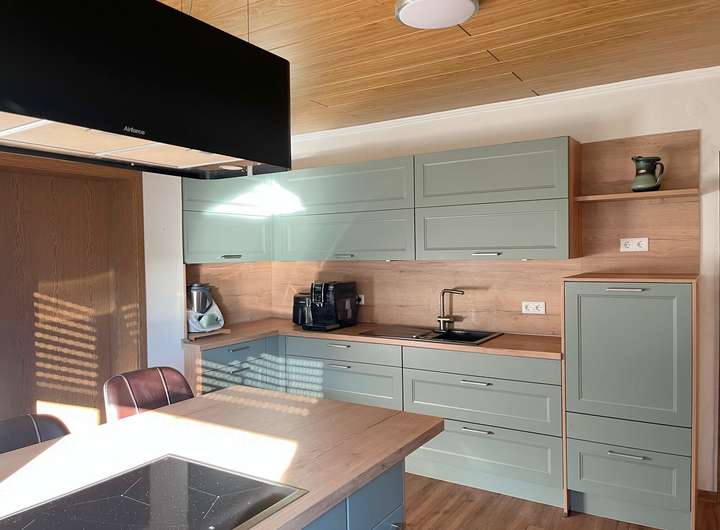 Im Obergeschoss erwarten Sie zwei Schlafzimmer, eines davon mit Zugang zum Balkon. Das Badezimmer ist sehr großzügig geschnitten, hochwertig ausgestattet und verfügt über eine Dusche; eine Badewanne lässt sich zusätzlich integrieren. Aufgrund einer ursprünglich geplanten Teilung wurde eine Küchenzeile installiert – die Etage kann daher flexibel als eigenständiger Bereich oder nahtlos als Teil des Haupthauses genutzt werden.