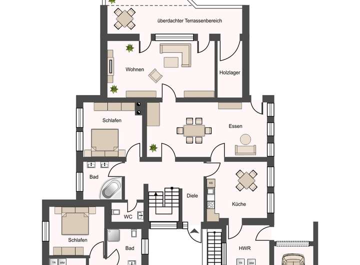Das Haupthaus überzeugt durch seine durchdachte Aufteilung. Im Erdgeschoss erwarten Sie ein großes Esszimmer, ein geräumiges Wohnzimmer mit Zugang zur Terrasse und in den Garten sowie eine moderne, hochwertige Einbauküche, die bereits im Kaufpreis enthalten ist. Zudem gibt es hier ein Schlafzimmer, ein Gäste-WC sowie ein Badezimmer mit Duschwanne und Doppelwaschbecken.