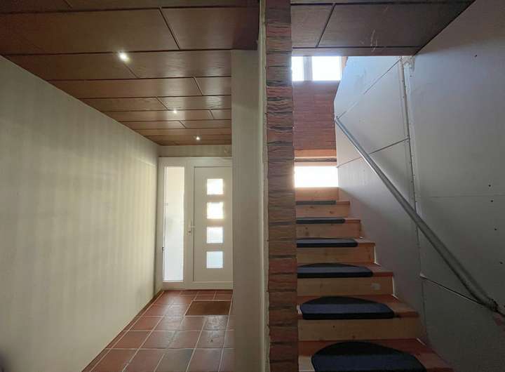 Beim Betreten des Hauses gelangen Sie in die ursprünglich großzügig angelegte Diele, über die alle Bereiche des Erdgeschosses erreichbar sind. Aktuell sorgt eine Leichtbauwand für eine zusätzliche Abtrennung; auf Wunsch lässt sich diese mit überschaubarem Aufwand wieder entfernen, sodass der offene Charakter der Diele erneut zur Geltung kommt.