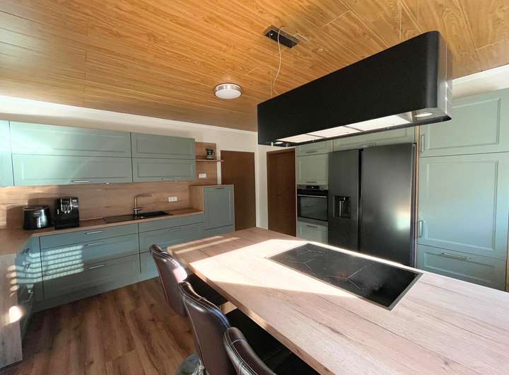 Rechts schließt die neue moderne Einbauküche an – mit stilvoller Kücheninsel, großem Kühlschrank, Spülmaschine und hochwertigen Geräten. Die Küche ist im Kaufpreis enthalten und bildet das funktionale Herz des Hauses. Angrenzend lädt das helle Esszimmer zu gemeinsamen Mahlzeiten ein, während das großzügige Wohnzimmer mit Kamin für eine gemütliche Atmosphäre sorgt. Von hier führt der Weg auf die große Terrasse und in den weitläufigen Garten. Zudem befinden sich im Erdgeschoss ein Schlafzimmer, ein Gäste-WC sowie ein Badezimmer mit Duschwanne und Doppelwaschbecken. Ein Hauswirtschaftsraum, ein praktisches Holzlager und die Garage mit direktem Zugang ins Haus runden diese Ebene ab.