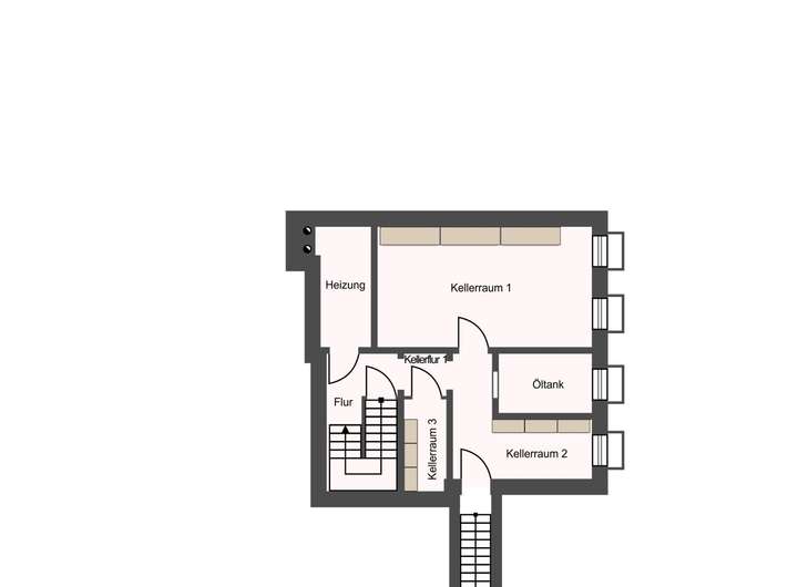 Vom Eingangsbereich führt eine Treppe ins Kellergeschoss (innen und außen zugänglich). Auf ca. 61 m² stehen mehrere Kellerräume zur Verfügung – vielseitig nutzbar als Stauraum oder Hobbyflächen. Hier befinden sich die Heizungsanlage sowie zwei 2.000-Liter-Öltanks; ein großzügiger Partyraum erweitert die Nutzungsmöglichkeiten.