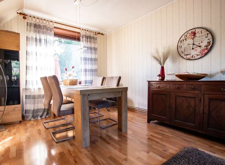 * Böden: Laminat und Fliesen; Holzvertäfelungen teilweise