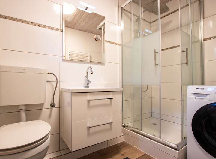 * Badezimmer mit Dusche, Waschbecken und Waschmaschinenanschluss