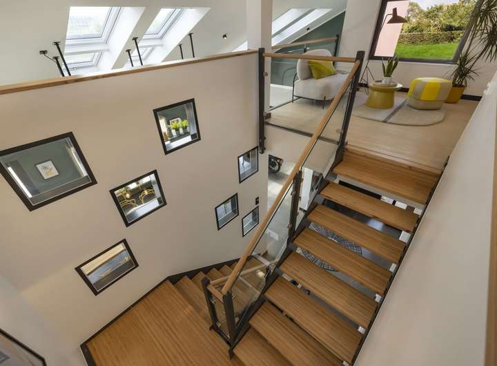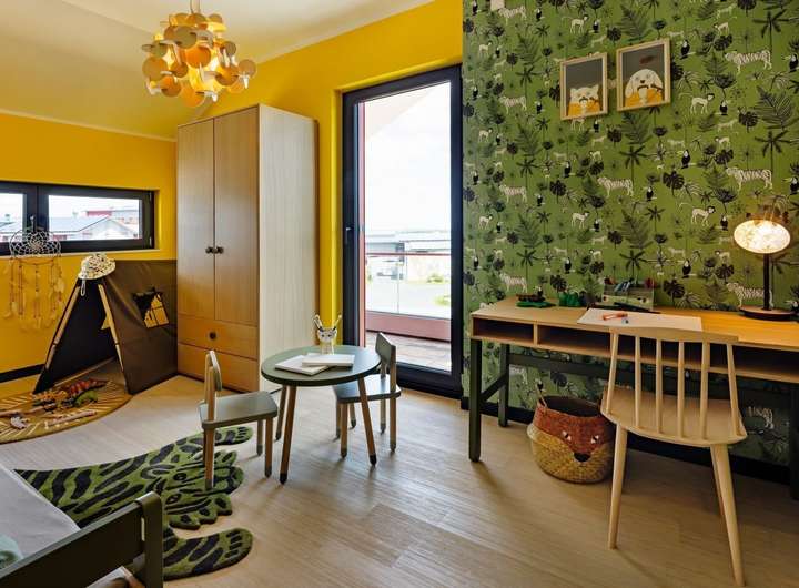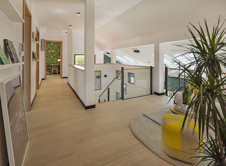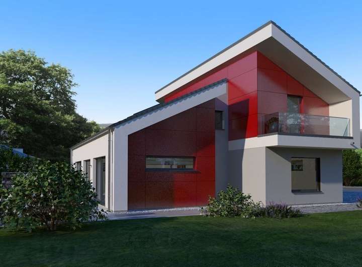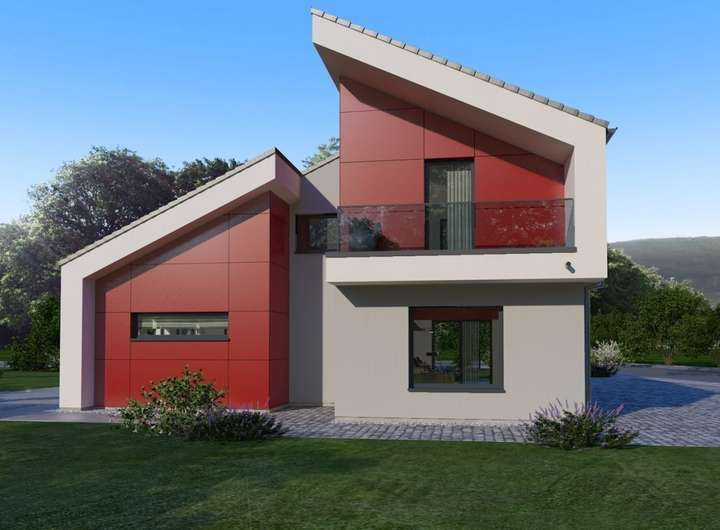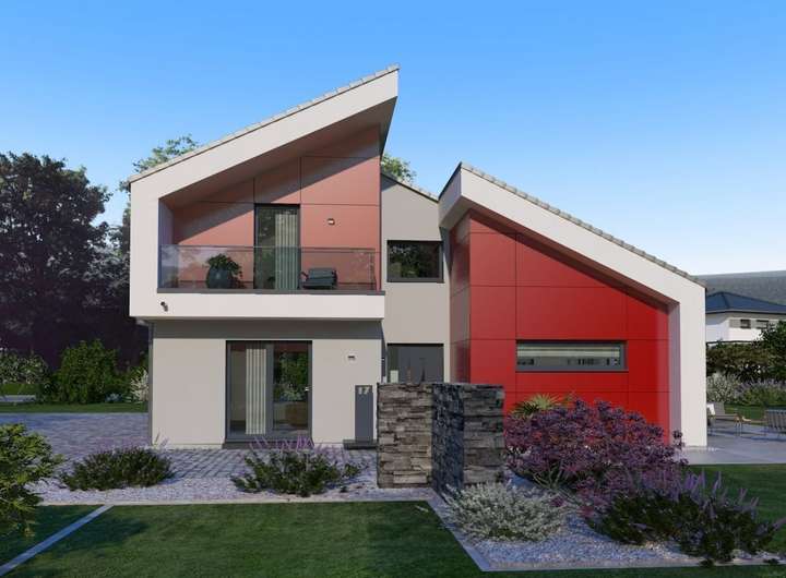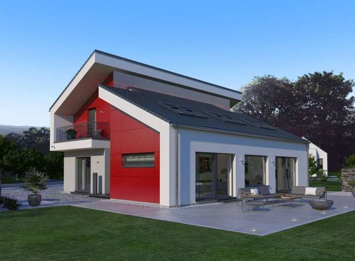 Bei unserem Pult 30 trifft eine außergewöhnliche Fassadengestaltung auf ein Wohnerlebnis der besonderen Art. Die Außengestaltung wird geprägt durch das versetzte Pultdach und den Rückversatz eines Bauteils, der durch zwei überdachte Balkone nicht nur optische, sondern auch echte wohnliche Mehrwerte mit sich bringt. Diese Mehrwerte setzen sich auch im Inneren fort. Attraktiver Mittelpunkt ist der mehr als 55 m² große Wohn-Ess-Koch-Bereich, der mit zahlreichen Fensterelementen und mit den hohen Decken punktet und dadurch noch größer wirkt. Auch der Rückzugsort der Eltern befindet sich Parterre: mit Schlafbereich, Ankleidezimmer, Badezimmer und separater Toilette. Büro und Gäste-WC runden das Raumangebot im Erdgeschoss ab. Oben: das Reich der Kinder. Highlights hier sind die beiden Balkone und die große Galerie.