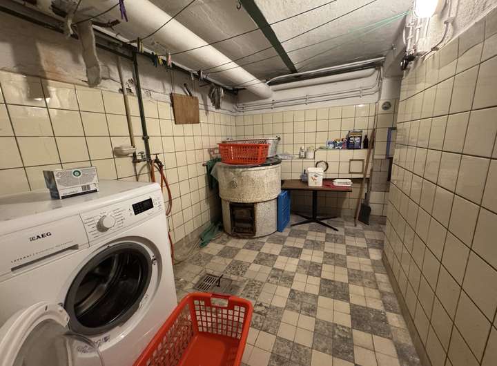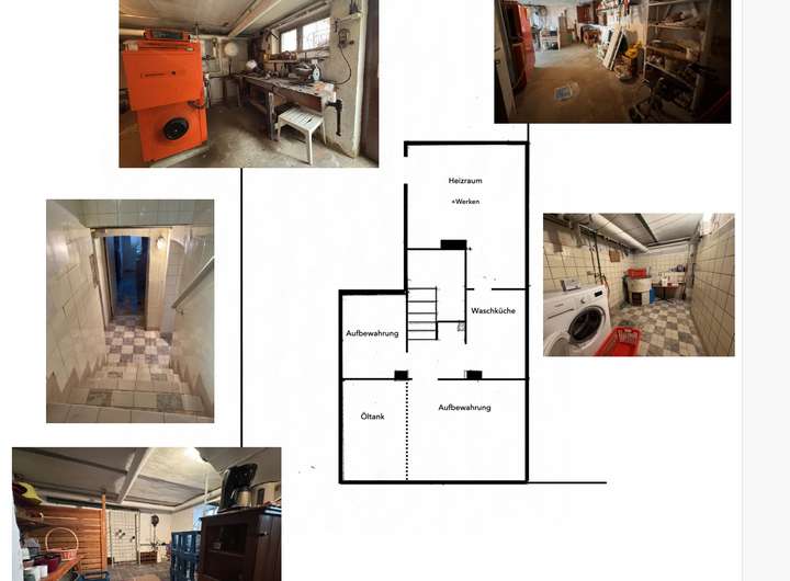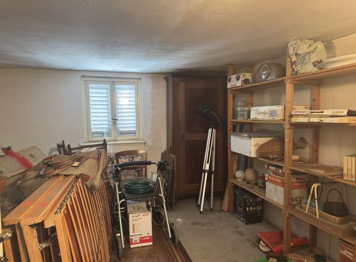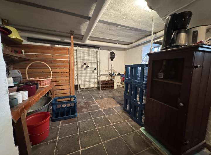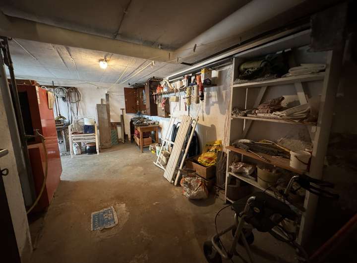 Kellergeschoss: Deckenhöhe 1,85m und 2,00m. Fußboden mit Zementestrich, Steinzeug und Asphalt-Plattenbelag. Stahlfenster mit Einfachverglasung und Gitter, Öltank circa 4700 l, massive Stufen mit Steinzeugbelag zum Erdgeschoss. Eine zusätzliche Außentreppe führt auch zum Keller.