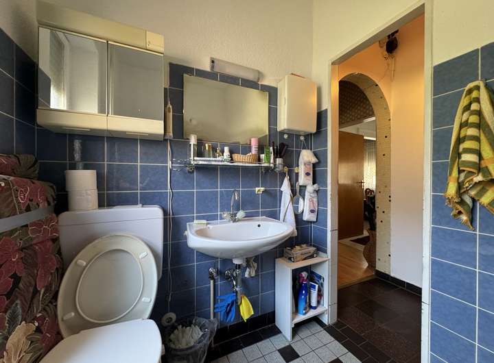 Erdgeschoss: Deckenhöhe 2,76 m und 2,74 m. Der Bodenbelag besteht aus Parkett, Laminat, Steinzeug und Teppichboden. Bad mit Wanne, Waschtisch und WC. Dazu ein Gäste WC. Zum
