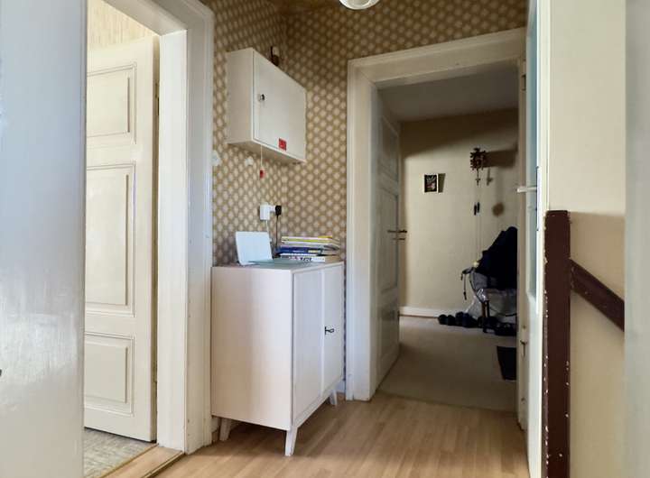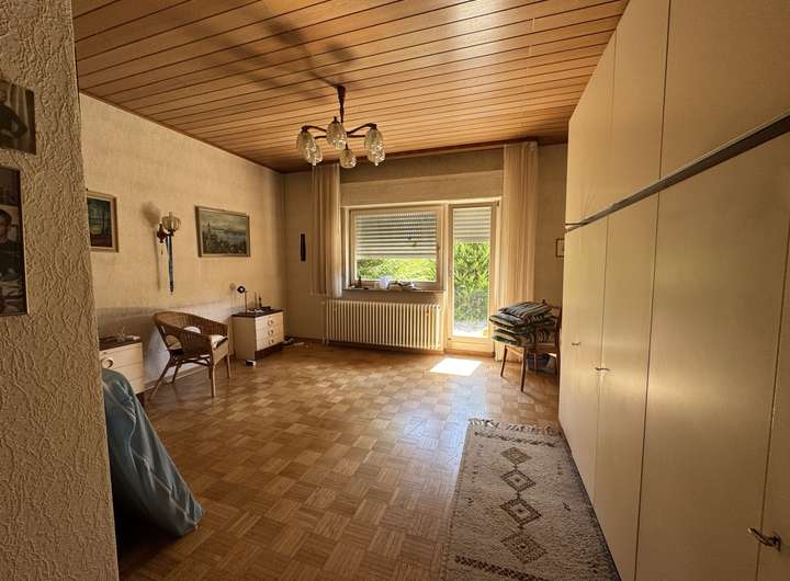 Obergeschoss: Deckenhöhe 2,43 m und 2,47 m im Anbau. Es findet sich Teppichboden, PVC-Bodenbelag und Parkett. Auf der Gartenseite befindet sich ein Balkon.