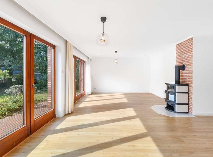 Erdgeschoss: großzügiges Wohn- und Esszimmer mit Kamin und Zugang zur großen Südwest-Terrasse