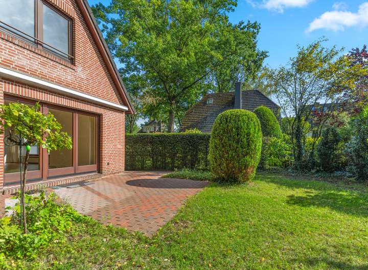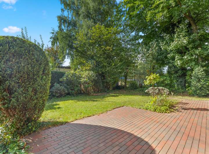 Das ca. 590m² große Grundstück ist liebevoll angelegt und pflegeleicht gestaltet, mit gewachsenen Rhododendren, Ziersträuchern und einer großzügigen Rasenfläche.