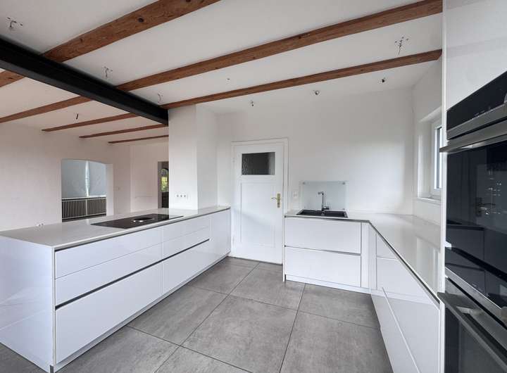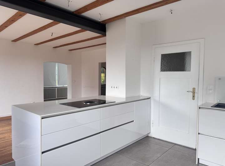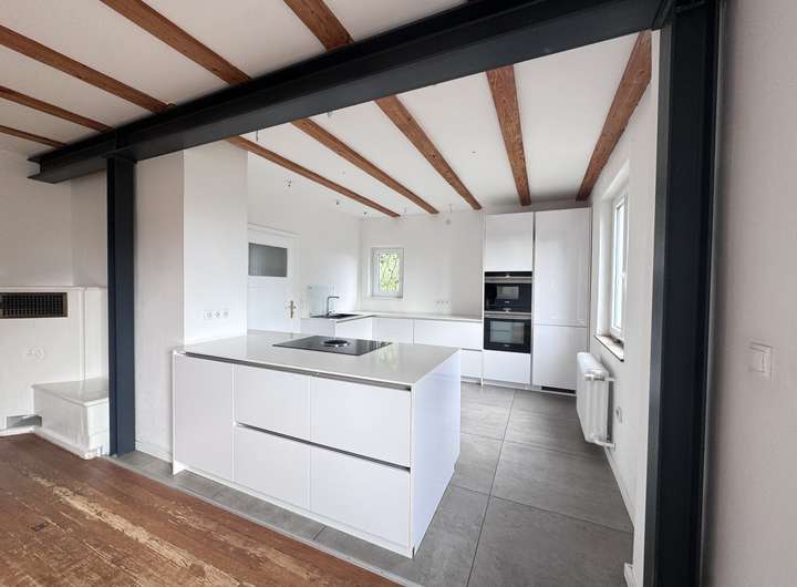 Gute und gepflegte Ausstattung, Fliesen, Parkett- und originale Holzdielenböden, modernes Bad und Gäste-WC, moderne Einbauküche, teilweise elektrische Rollläden, Wintergarten mit Verschattungsmöglichkeiten, Kaminofen, Außenpool, ....