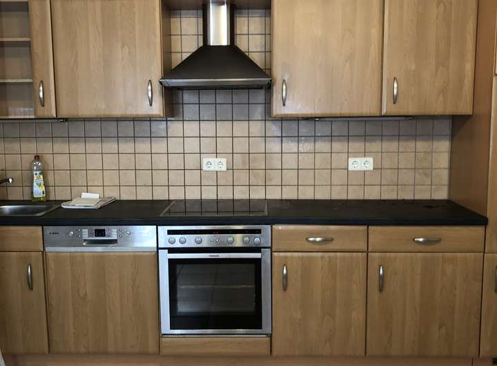 In der Küche haben Sie terracottafarbene Bodenfliesen. Die helle Einbauküche in L-Form mit allen eingebauten Elektrogeräten ist im Kaufpreis enthalten.