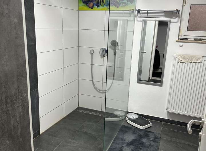 Ein besonderes Highlight ist das neu erstellte großzügige Badezimmer mit begehbarer Dusche in modernem geschmackvollem Ambiente. Im Badezimmer wurden anthrazitfarbene Fliesen im modernen Format auf dem Boden verlegt und weiße Wandfliesen gewählt.