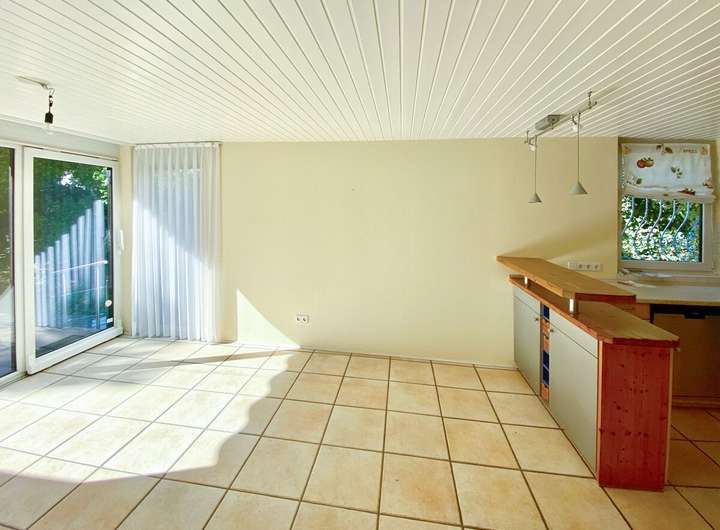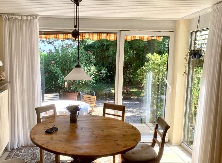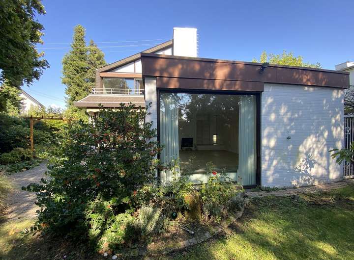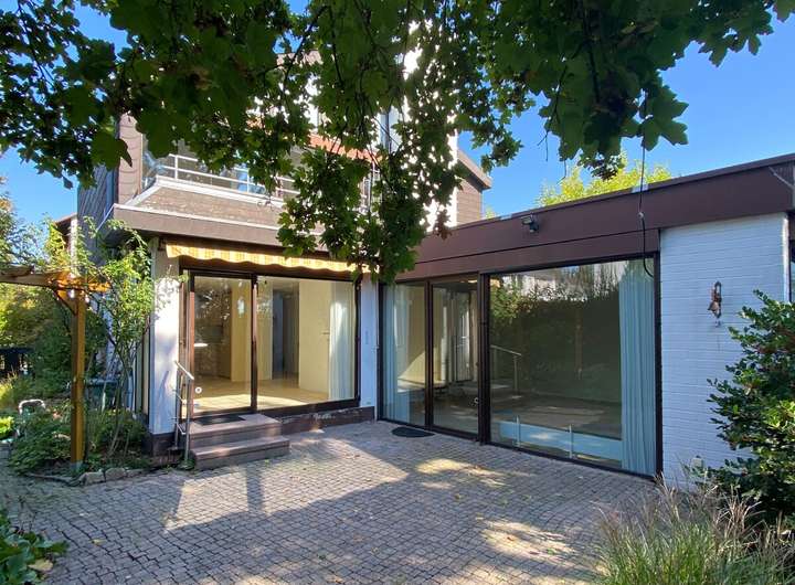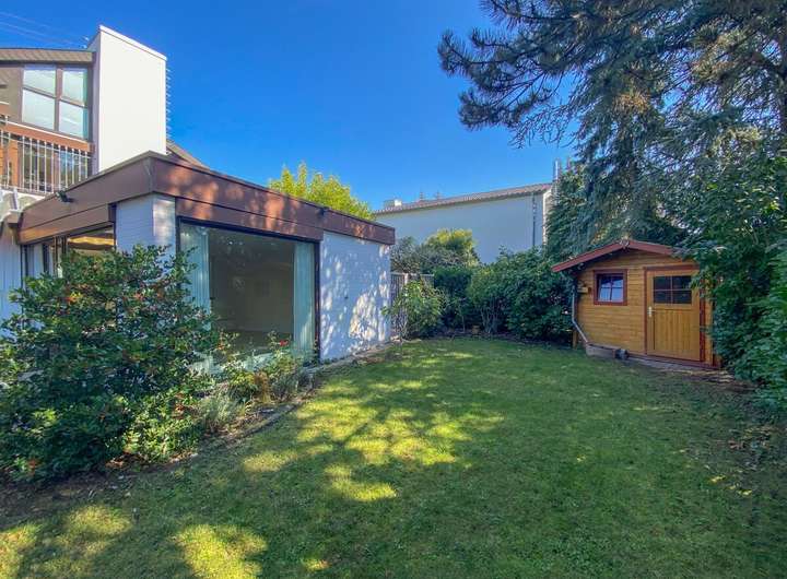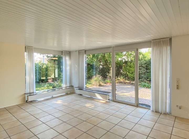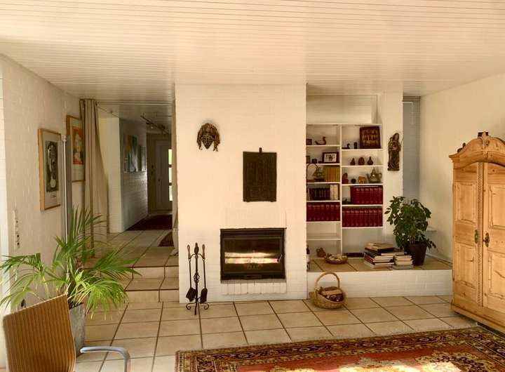 Das Wohnzimmer im Flachdach-Anbau ist die Besonderheit der Immobilie: Der Wohnraum mit offenem Kamin liegt 2 Stufen tiefer als der Essbereich. Die bodentiefe Fenster geben dem Raum sehr viel Licht. Der Blick in den gepflegten Garten begeistert immer wieder.