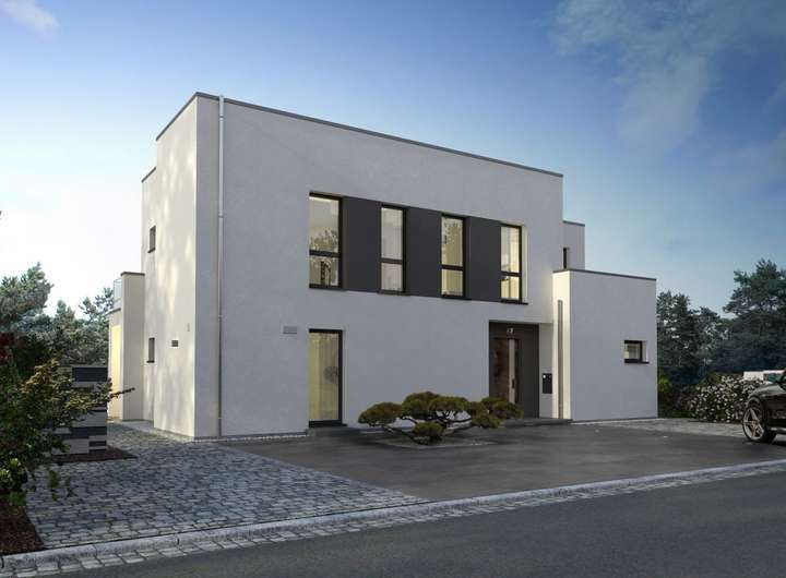 Kleinere und größere rechteckige Elemente fügen sich bei unserem Black Label 17 zu einem harmonischen Ganzen zusammen, das mit einer außergewöhnlichen Fassade, mit Vorsprüngen und Rückversätzen und vor allem mit zahlreichen wohnlichen Mehrwerten überzeugt. So punktet das Einfamilienhaus auf der Rückseite im Obergeschoss mit einem großen Balkon, während darunter ein überdachter Terrassenbereich entsteht, der sich perfekt an den Erker schmiegt, der im Inneren dem Essbereich einen ganz besonderen Schnitt verleiht. Apropos Inneres: Das bietet den künftigen Eigenheimbesitzern eine Wohnfläche von mehr als 200 m², verteilt auf zwei Ebenen. Im Erdgeschoss befinden sich neben dem geräumigen Wohn-Ess-Koch-Bereich, der durch eine zentral gelegene Speisekammer von Flur und Dielenbereich abgetrennt wird, ein Hauswirtschaftsraum sowie ein Gäste-WC. Vom großen Flur führt der Weg ins Obergeschoss. Hier befinden sich zwei Kinderzimmer, die jeweils über einen Zugang zu einem eigenen Balkon und einem separaten Bad verfügen, das große Elternschlafzimmer mit Ankleide, Badezimmer und einem weiteren Balkon. Verbindendes Element in der ersten Etage ist die Galerie, in der ausreichend Platz für eine kleine Bibliothek oder eine Relax-Ecke ist.