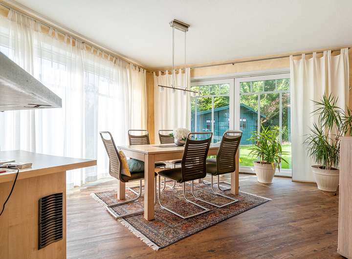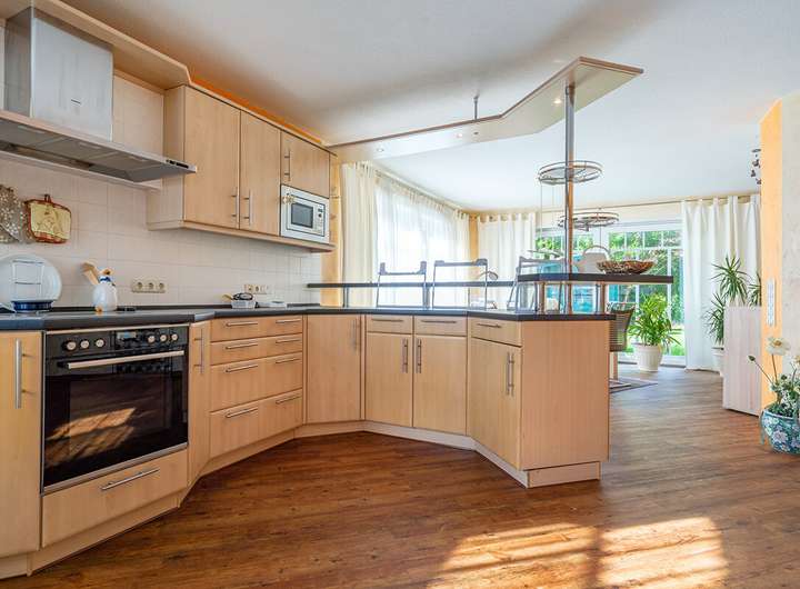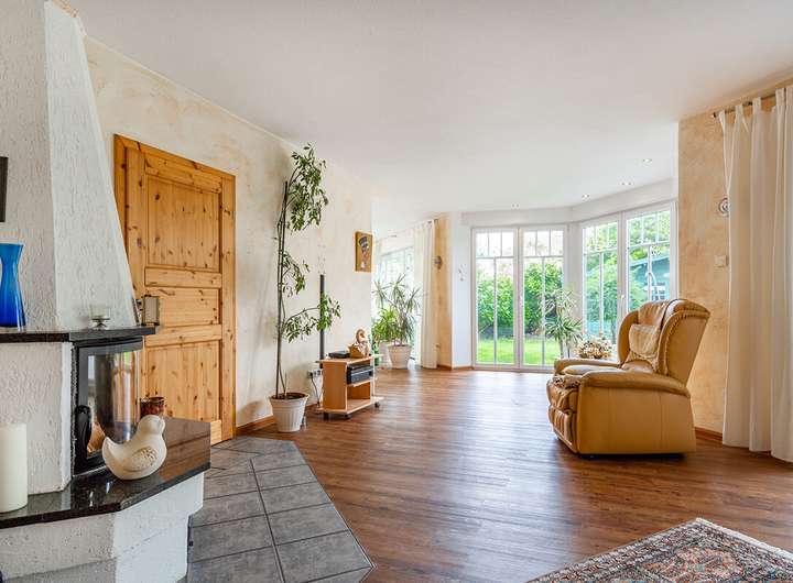 Bereits beim Betreten des Hauses überzeugt der großzügige und lichtdurchflutete Wohn- und Essbereich, der mit einem stilvollen Kamin zum Mittelpunkt des Familienlebens wird. Große Fensterflächen sorgen für ein helles, freundliches Ambiente, das sich durch das gesamte Haus zieht. Die Einbauküche ist offen in den Wohnbereich integriert – perfekt für gemeinsames Kochen und gesellige Abende.