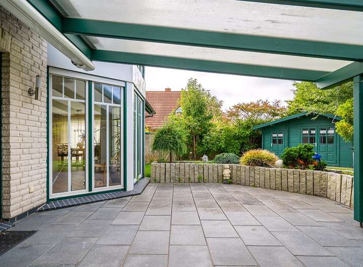 Ein weiteres Highlight ist die gemütliche Terrasse mit Süd-West-Ausrichtung – ideal, um sonnige Nachmittage und laue Abende im eigenen Garten zu genießen. Der Außenbereich ist pflegeleicht angelegt und bietet sowohl Kindern als auch Erwachsenen Raum zur Entfaltung.