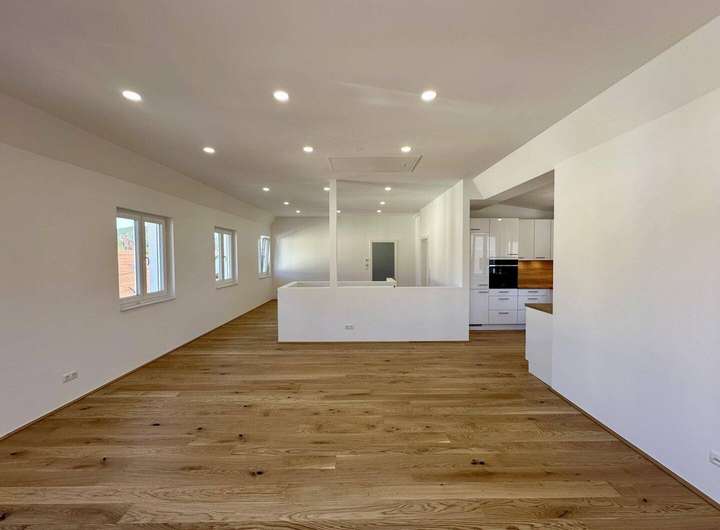 Großes Wohnzimmer mit offener Küche mit Siemensgeräten