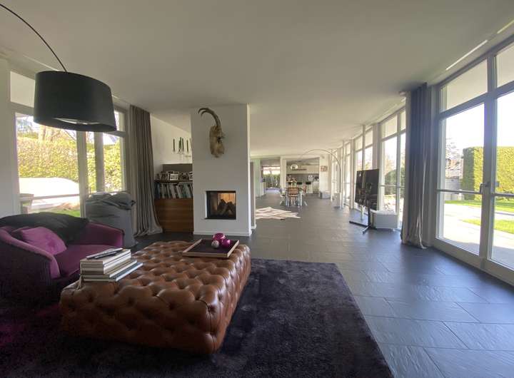 Von der Diele aus betreten Sie auch den ca. 72 m² offenen Wohn- und Essbereich mit Aussicht in den schönen Garten sowie mit direktem Zutritt auf die große sonnige Terrasse. Die gegenüberliegenden Fenstertüren bieten einen Blick auf den Pool mit eigenem Deck und weiterem Garten.