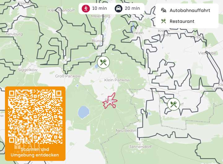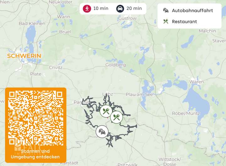 Auch die Autobahn A24 (Anschluss Suckow) liegt nur rund 15 km entfernt und bietet eine gute Anbindung in Richtung Hamburg und Berlin. Die Umgebung rund um Redlin ist landschaftlich reizvoll – mit der Müritz-Elde-Wasserstraße, dem Blanksee, dem Treptowsee und mehreren kleinen Naturschutzgebieten in der Nähe. So verbindet sich hier ländliche Ruhe mit einer soliden Grundversorgung und guter regionaler Erreichbarkeit.