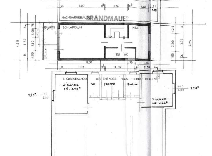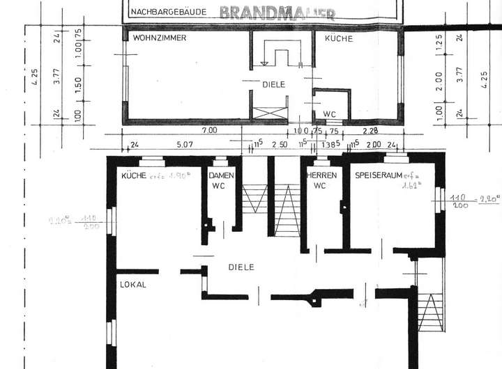 Der Bauantrag für das Hauptgebäude stammt aus dem Jahr 1892, die Bauanträge für das Hinterhaus stammen von 1974 und 1985 (Erweiterung). Das Hautgebäude besteht aus drei Vollgeschossen mit im EG dem Restaurant und Außenbereich und im OG sowie dem DG jeweils zwei Wohn-Mieteinheiten. Das OG besitzt einen Balkon. Der Keller wird, bis auf einen kleinen Heizungsraum, komplett als Lagerfläche des Restaurants genutzt. Die Grundstücksgröße ist 515 qm.