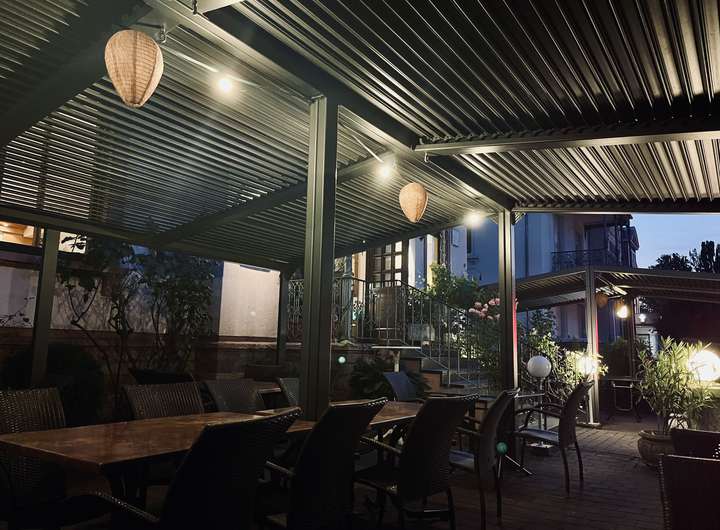 Im gleichen Zeitraum wurden zwei Überdachungen für den Gastronomie-Außenbereich genehmigt und erstellt. Das mit Schiefer gedeckte Dach hat eine Zwischensparren-Dämmung.
