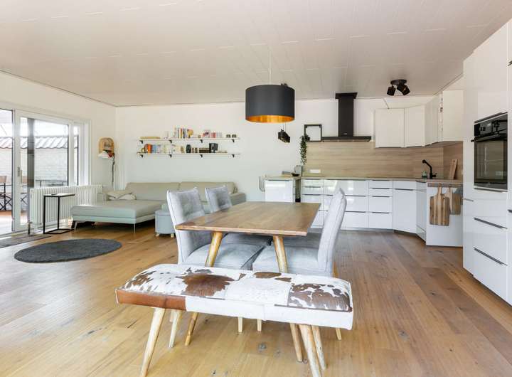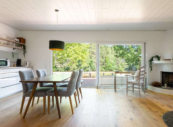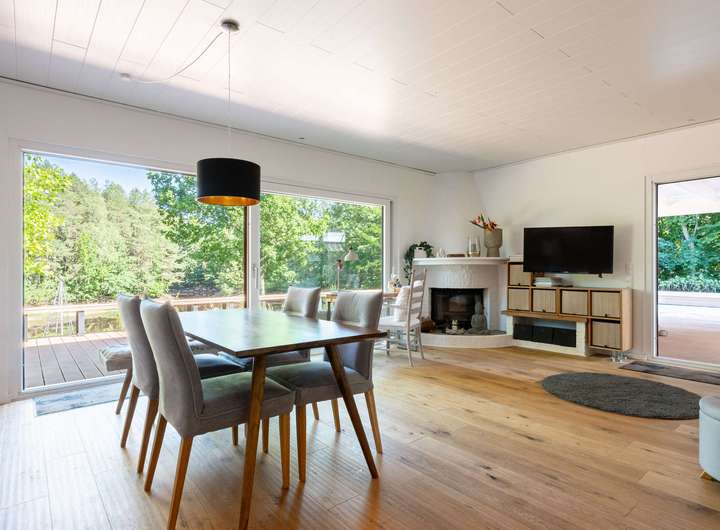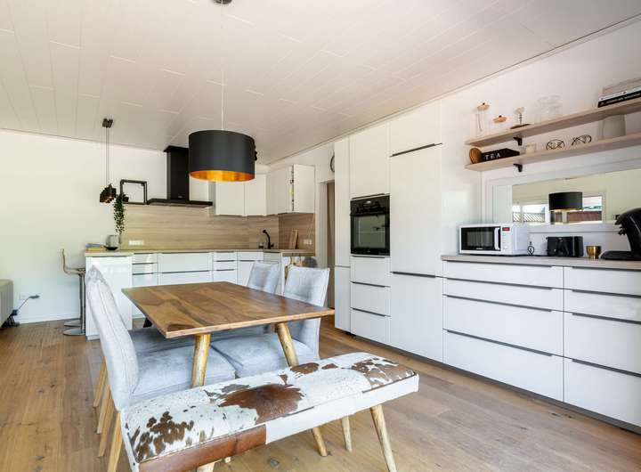 Das Wohnhaus selbst vereint Komfort und behaglichen Charme. Im offenen Wohn- und Essbereich mit Küche trifft Gemütlichkeit auf Weite. Große Fensterfronten schenken lichtdurchflutete Räume und eröffnen einen atemberaubenden Blick über den See – Natur wird hier zum Teil des Wohnens. Zwei ruhige Schlafzimmer, ein zusätzliches Arbeits- oder Gästezimmer, ein helles Bad sowie ein separates Gäste-WC bieten Komfort für die ganze Familie. Der lichtdurchflutete Wintergarten schafft einen weiteren naturnahen Rückzugsort. Ergänzt wird das Raumangebot durch mehrere großzügige und praktische Kellerräume. Auf dieser Ebene finden Sie ebenfalls die Garage, welche neben der Scheune und dem Hof ausreichend PKW Stellplätze bietet.